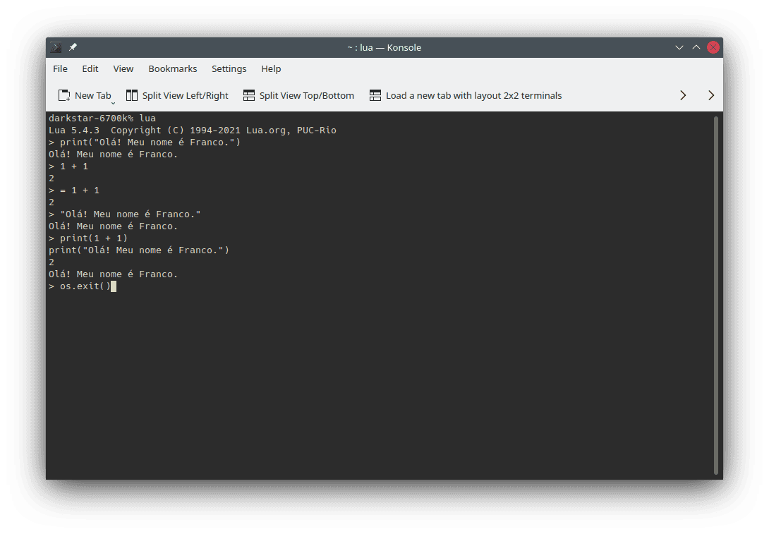 Doravante, toda vez que você ler um bloco de código em Lua e quiser executá-lo manualmente no interpretador, basta seguir os passos anteriores.